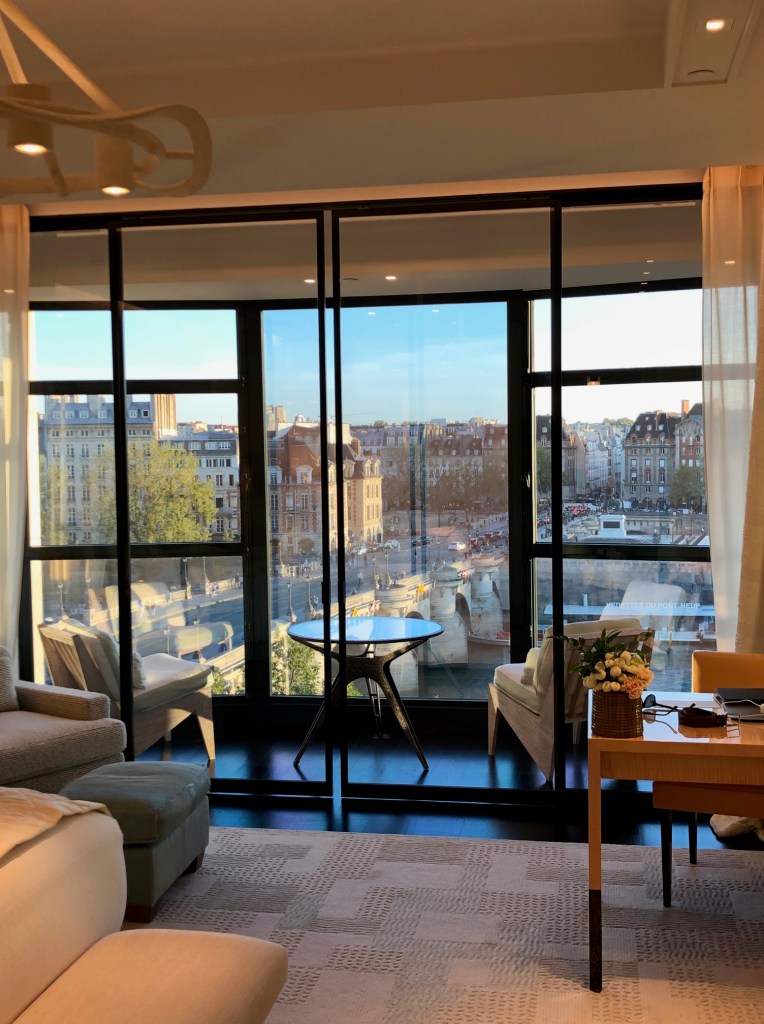 In the CB, we had a “junior suite” with a stunning view of the Seine and the Pont Neuf, truly one of the most unforgettably picturesque vistas we’ve experienced in all our travels, and in itself reason enough for a stay. But this was a “suite” in name only, since to the Spoiled Guest the word means a living space with one or more separate bedrooms, and what we had was a decently-sized king bed room with a small walk-in closet and a small, infinite-mirrored toilet separate from the main bath. Perhaps they mean the narrow seating area overlooking the Seine out the floor-to-ceiling windows to constitute a separate “room,” but that’s stretching things.