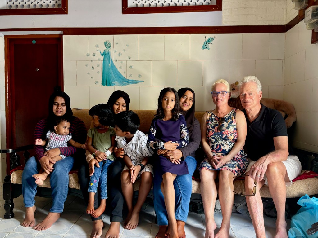 First stop is a turtle rescue facility, staffed by British and Aussie women there on a working holiday. Amazing dedication, and wonderful turtles in big blue cement tanks, mostly maimed by fishing nets and missing front limbs. We adopt one for $65. Then more slow driving through town in the excruciating heat, to a lovely public beach and, finally, back to Naajy’s house for a photo shoot with all the many kids, sibling and in-law ladies, and an 8 year old, gorgeous baby girl. Finally the original dude rides us back to the dock and we’re returned to the luxuries of Kudadoo by high speed boat. Quick nap, then another amazing massage in the room, and then to a beautiful dinner on the beach, including a surprise (even to me) birthday cake for C. Giggling waiter, who may be autistic, adds levity to the affair. Home to FB on the deck, and bed.