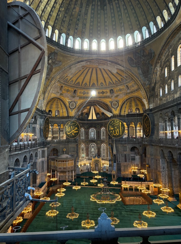 Up at 7:30 to be ready for our tour. Nice breakfast in the huge lobby dining room, charming staff, beautiful cool day. Our guide — I’ll call him Brutus — is nice without being overly talkative. We take a sumptuous van with its own driver to Hagia Sofia, which is stunning, then, because the Blue Mosque doesn’t open till 2:30 on Fridays, we visit a cistern in the basement of what appears to be a combined office building/gallery. After the cistern tour, I enquire about the Northwestern Wildcats decal on the wall, and we’re immediately in the thrall of who we’ll soon learn is a rug merchant, suave and well-dressed, with perfect English, who regales us with the tales of some relative who went to Northwestern before taking us upstairs and subjecting us to the choreographed floor show of rug display. So we’ve been pleasantly abducted and our pleasant ransom will be a $13,500 rug — very beautiful, but really?