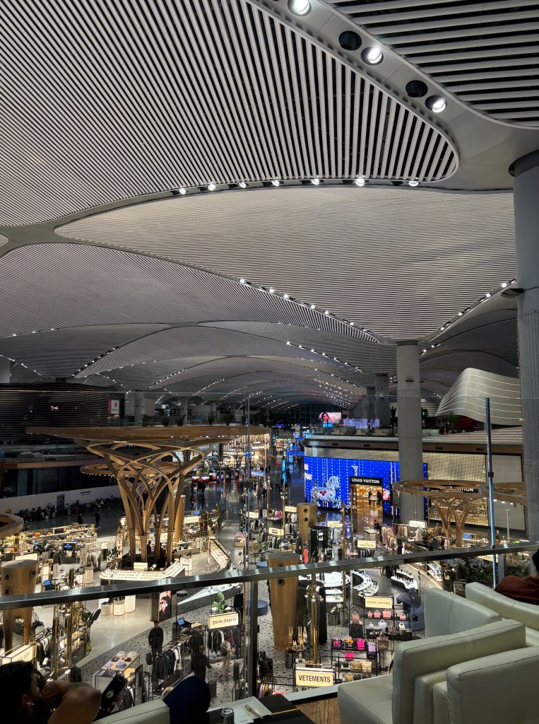 Home in the dusk, more packing, then to Gallada for a last dinner, again delightful. Off to the airport at 11 pm, about an hour drive. We’re met by a porter and our facilitator guy, who whisk us through security and check-in and to the vast, complicated Turkish Airlines Business Class lounge, where our guy leaves us for an hour and a half till boarding. Many food stations, an array of seating, overlooking the enormous high-end shopping mall enclosed by the even more enormous Istanbul Airport. Our guy reappears to golf cart us to the gate, which must be a half mile down the huge concourse. I tip him not enough, and shortly we’re aboard. Slightly smaller plane than our last (A 330), but same seats and nice though not as elaborate meal service. Seven hours sleep later, a quick breakfast and we’re at Male, in the Maldives.