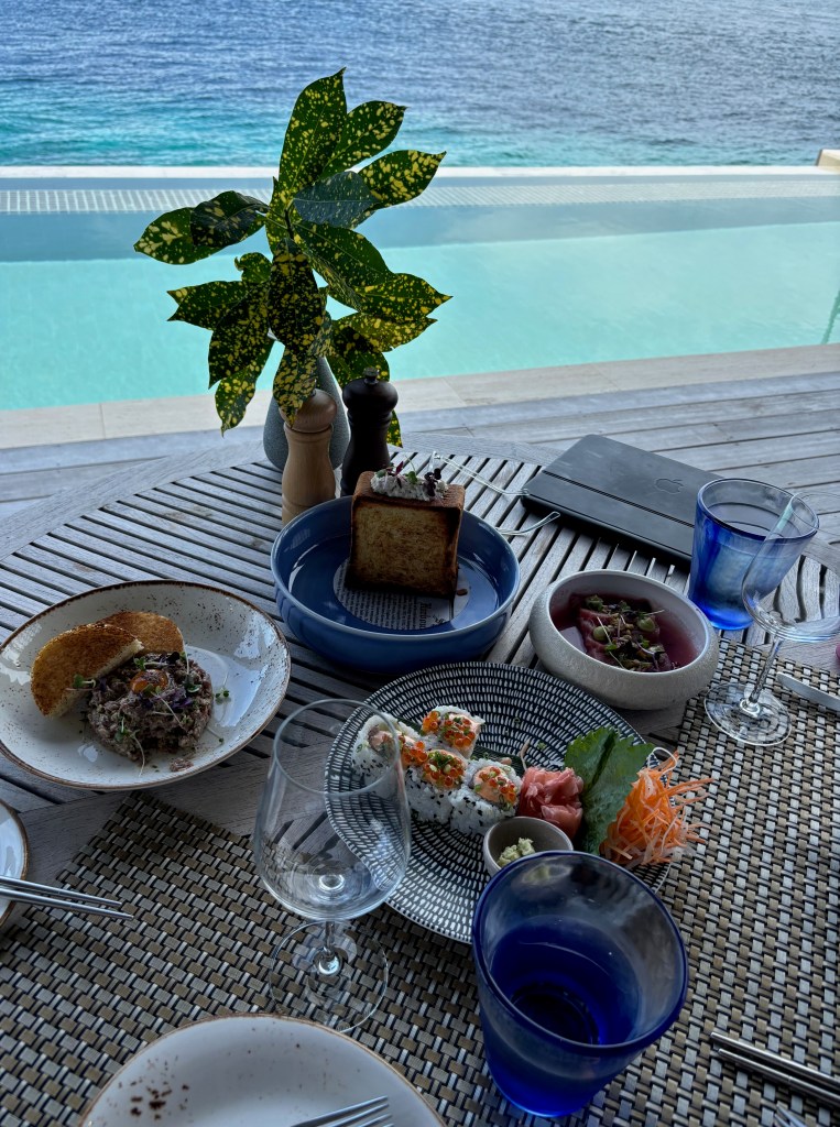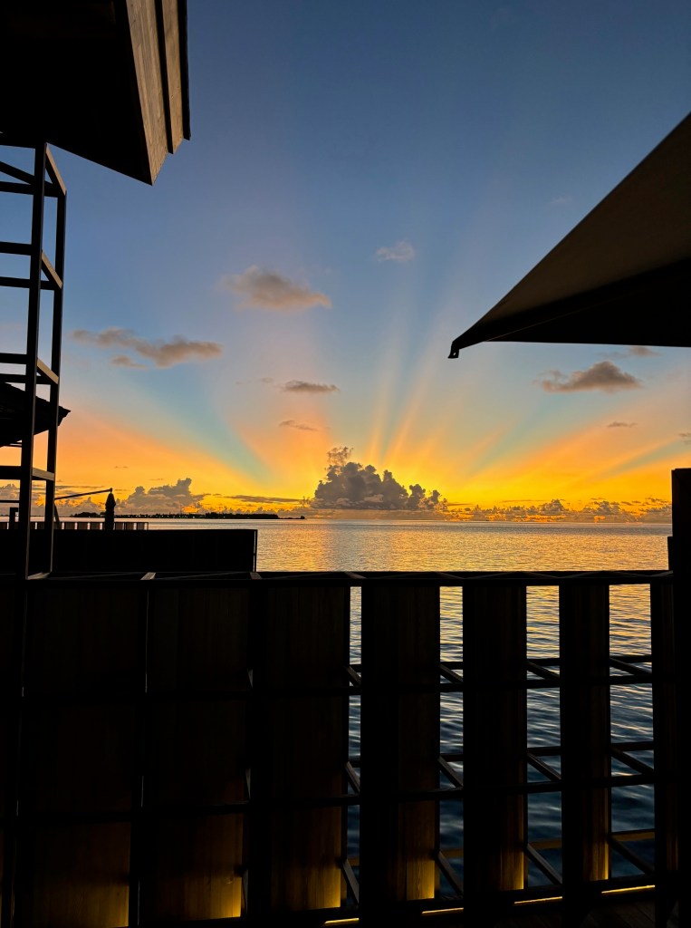 Slept better with the aid of Courtney’s Trazodone. Early excursion to the big(ger) island nearby for my first scuba dive, with the delightfully French “Morgan.” C goes to the big gym. I first have to see the island doctor, a very serious Maldivian woman, who takes my blood pressure (too high, but ok) and interrogates me about my medications. I pass, barely. Then a briefing by Morgan about diving basics (I’ve brought my PADI card, but have admitted I haven’t dived in about 5 years) and our route. We set out off the beach, tanks on backs, and I immediately fall over in the surf. After that, a smooth and beautiful one-hour reef dive — gorgeous creatures, including huge morays and sea cucumbers, and innumerable fish species —just wish I had a GoPro. Back to the spa after lunch for an amazing full body massage plus facial — an otherworldly experience. Dinner that night at the Teppanyaki place across the atoll —- fun and delectable. Boat and buggy home to bed.
