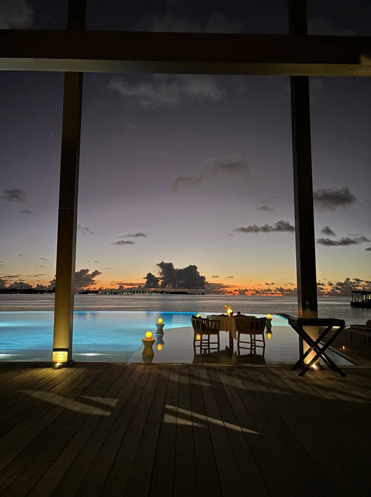 Up relatively late (Kudadoo is one hour later than Male’ time). Pre-ordered breakfast on our deck, delicious. Then to pedicures at the main building, lying flat, exquisite, despite my unsightly toenails. Lunch at the villa (Naajy carts us back and forth to all appointments, though the walk would be minimal), then I Sea-bob (those mini motorized submarine water scooters) along the reef next to the Kudadoo dock and we and our handsome guide head out on JetSkis in search of dolphins. It takes a while and a good distance, and we pass some unpromising atolls with dumps burning, but finally come upon a huge school of dolphins that we pace for half an hour. Back to the villa, clean up, then a sunset cruise with one other couple, thunderheads and rainbows as well as the sunset. Later, dinner at the main building, at tables in the shallow shelf of the pool, feet in four inches of water. The wind picks up and we move indoors seamlessly. Back to a waiting Fernet Branca at the villa, baklava on the deck, and to bed.