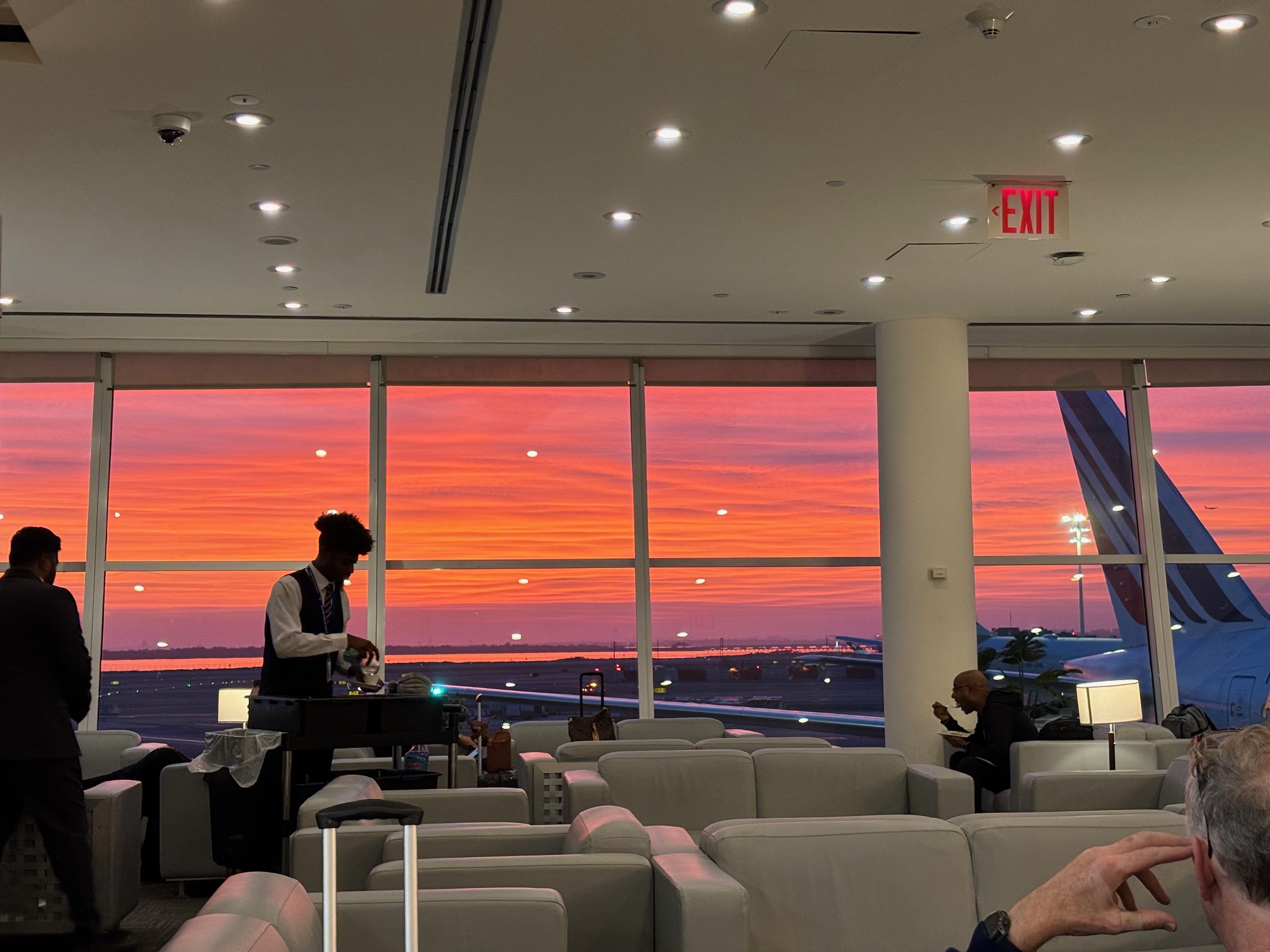TSA is a horror show, with different rules for different queues, and both our handbags are searched. But once through, we’re in the delightful Turkish Airline business class lounge, with spectacular sunset out the window and good food.