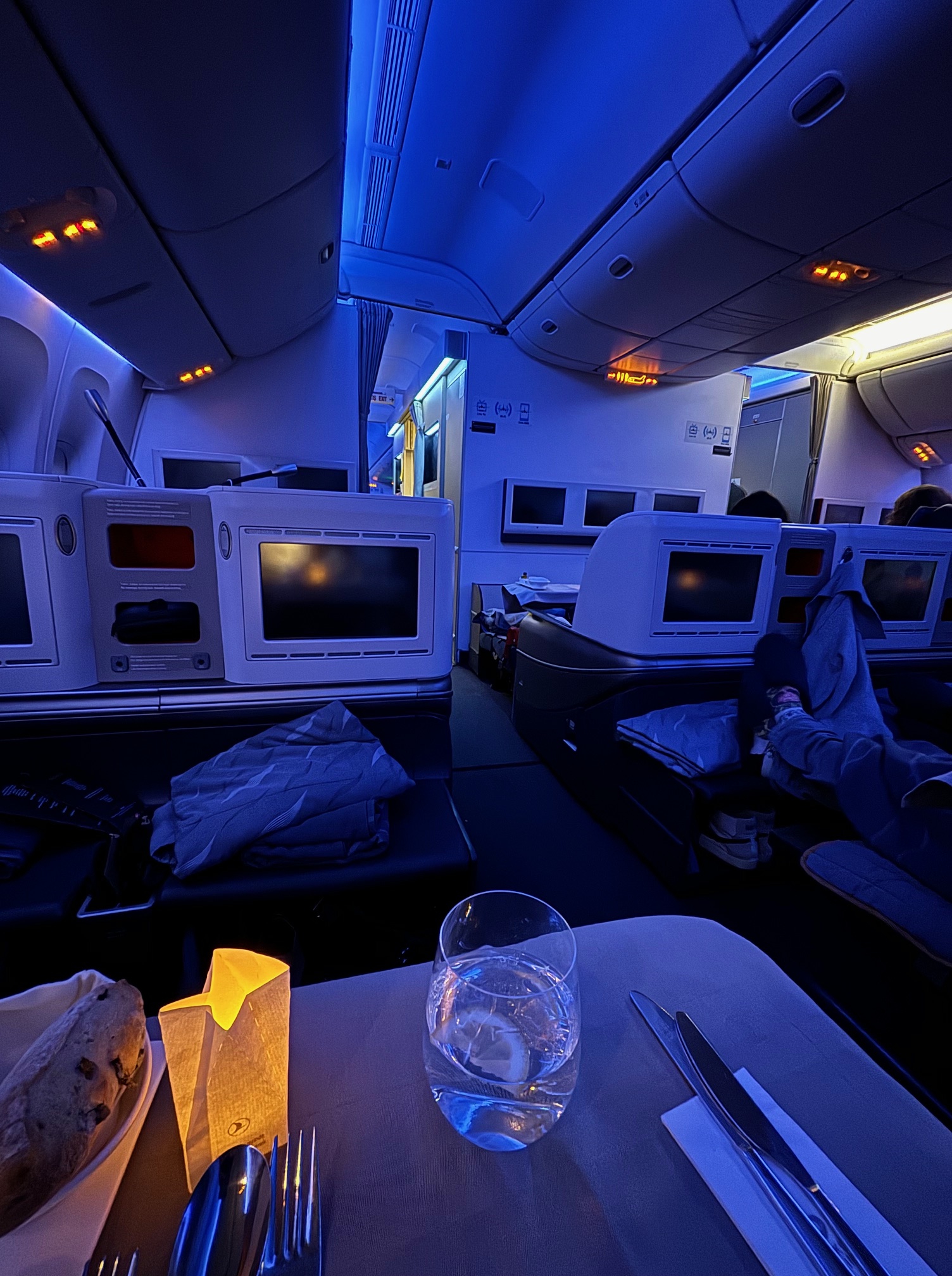 Then, at boarding time, we’re in the wrong queue for business class, which has its own dedicated line, but take matters in our own hands and get on quickly. Super-spacious cabin, 10 feet between rows, otherwise conventional lie-flats. Cabin crew is efficient and gracious. Nice meal, including tiny electric “candles,” then to sweaty sleep.