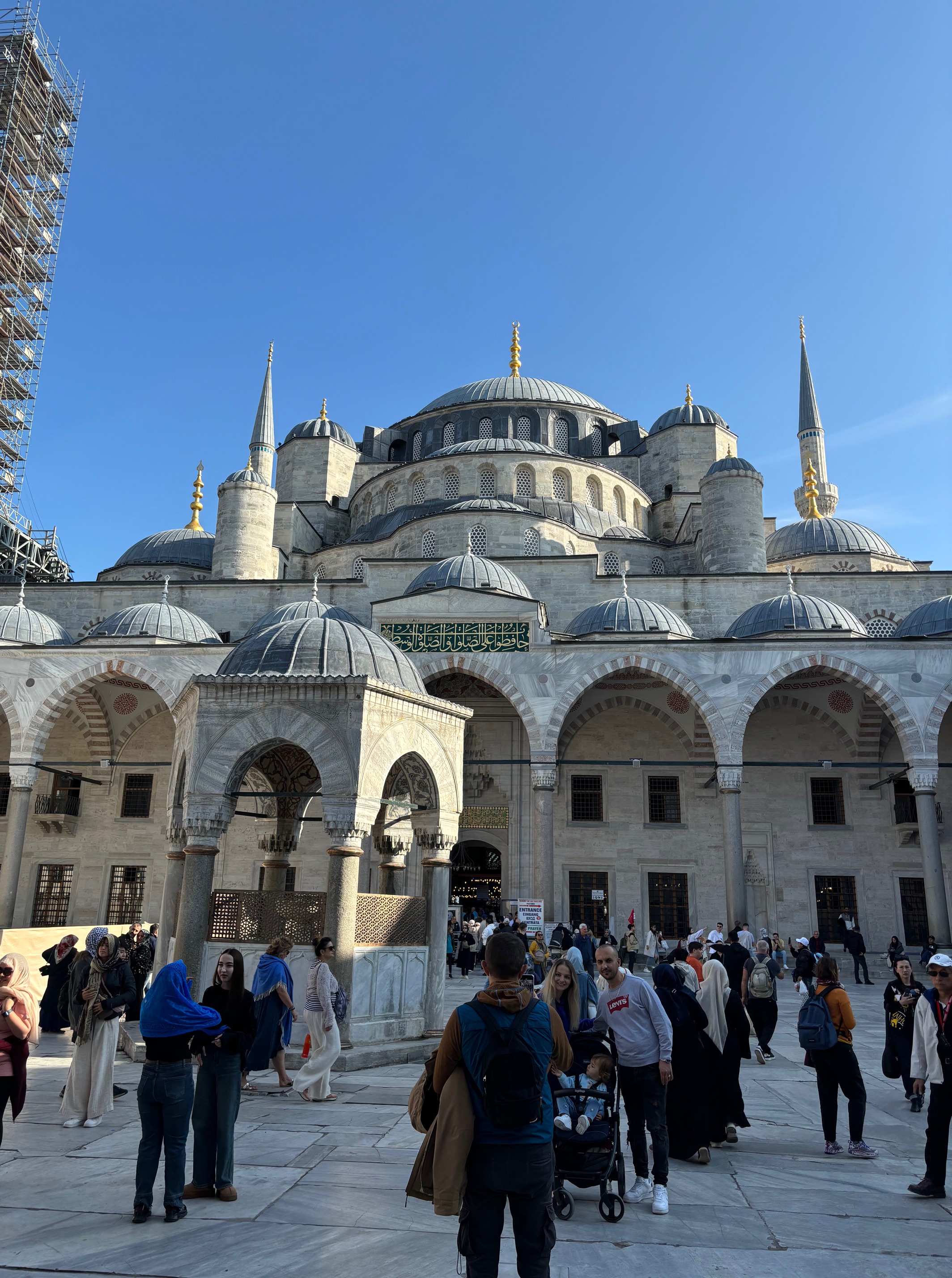 Up at 7:30 to be ready for our tour. Nice breakfast in the huge lobby dining room, charming staff, beautiful cool day. Our guide — I’ll call him Brutus — is nice without being overly talkative. We take a sumptuous van with its own driver to Hagia Sofia, which is stunning, then, because the Blue Mosque doesn’t open till 2:30 on Fridays, we visit a cistern in the basement of what appears to be a combined office building/gallery. After the cistern tour, I enquire about the Northwestern Wildcats decal on the wall, and we’re immediately in the thrall of who we’ll soon learn is a rug merchant, suave and well-dressed, with perfect English, who regales us with the tales of some relative who went to Northwestern before taking us upstairs and subjecting us to the choreographed floor show of rug display. So we’ve been pleasantly abducted and our pleasant ransom will be a $13,500 rug — very beautiful, but really?