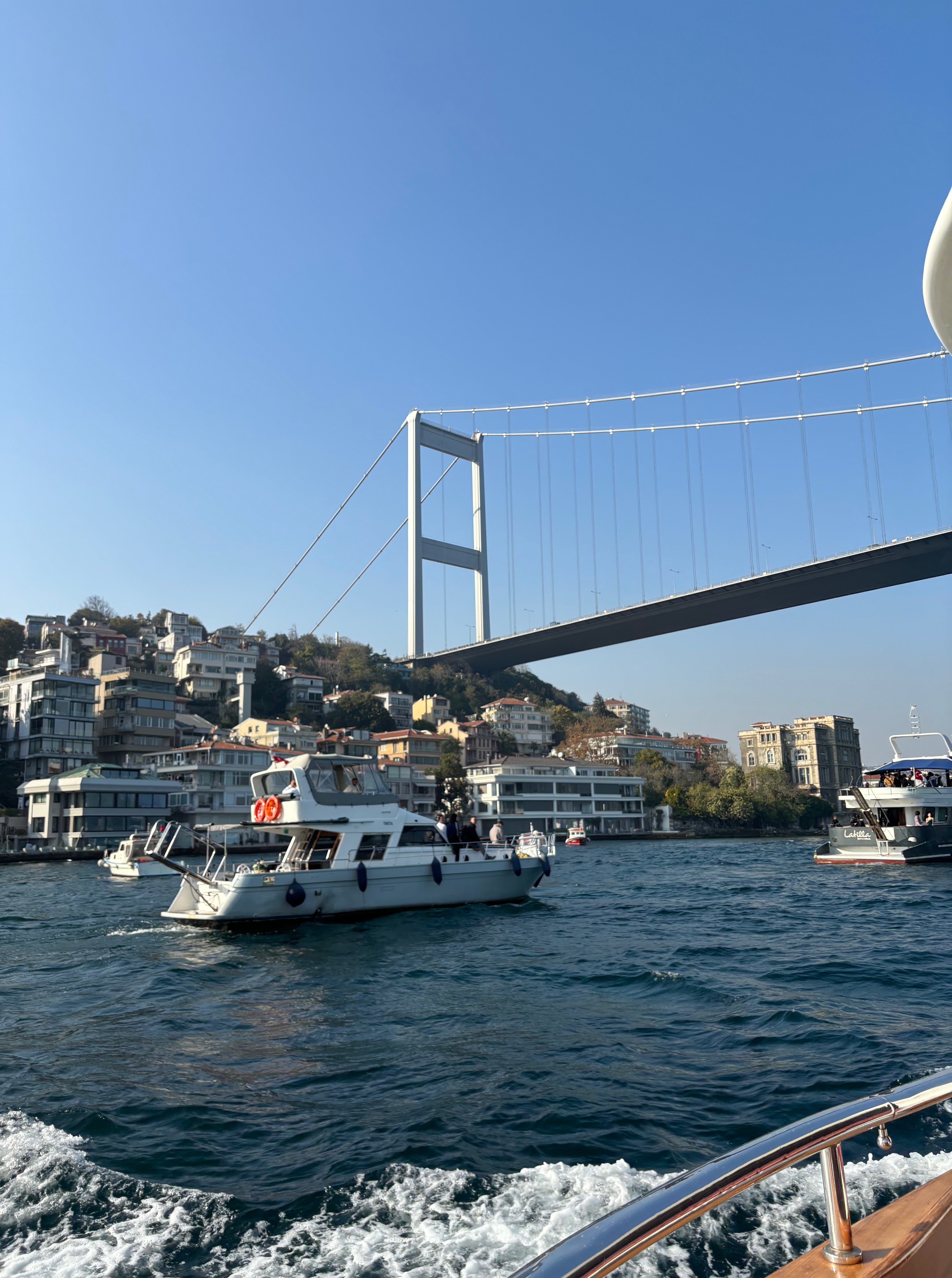 Late breakfast, some packing, and a delightful walk along the “Galataport,” a secured (scanner—only entry) promenade along the Bosporus, lined with beautiful shops and restaurants, including the Istanbul Modern (which we decide to skip). After, we meet the charming concierge, Nedrat, with whom I’d corresponded by email. She arranges a lunch for our Bosporus boat ride. Beautiful yacht which we board off the hotel’s dock, with a captain and young guy who provides intermittent commentary on the more prominent sights. Lovely lunch, stunning views on all sides, reminiscent of San Francisco but far more vast and populated. Amazing waterside homes, universities, ancient forts, soaring bridges not unlike the Golden Gate (but here there are three of them).