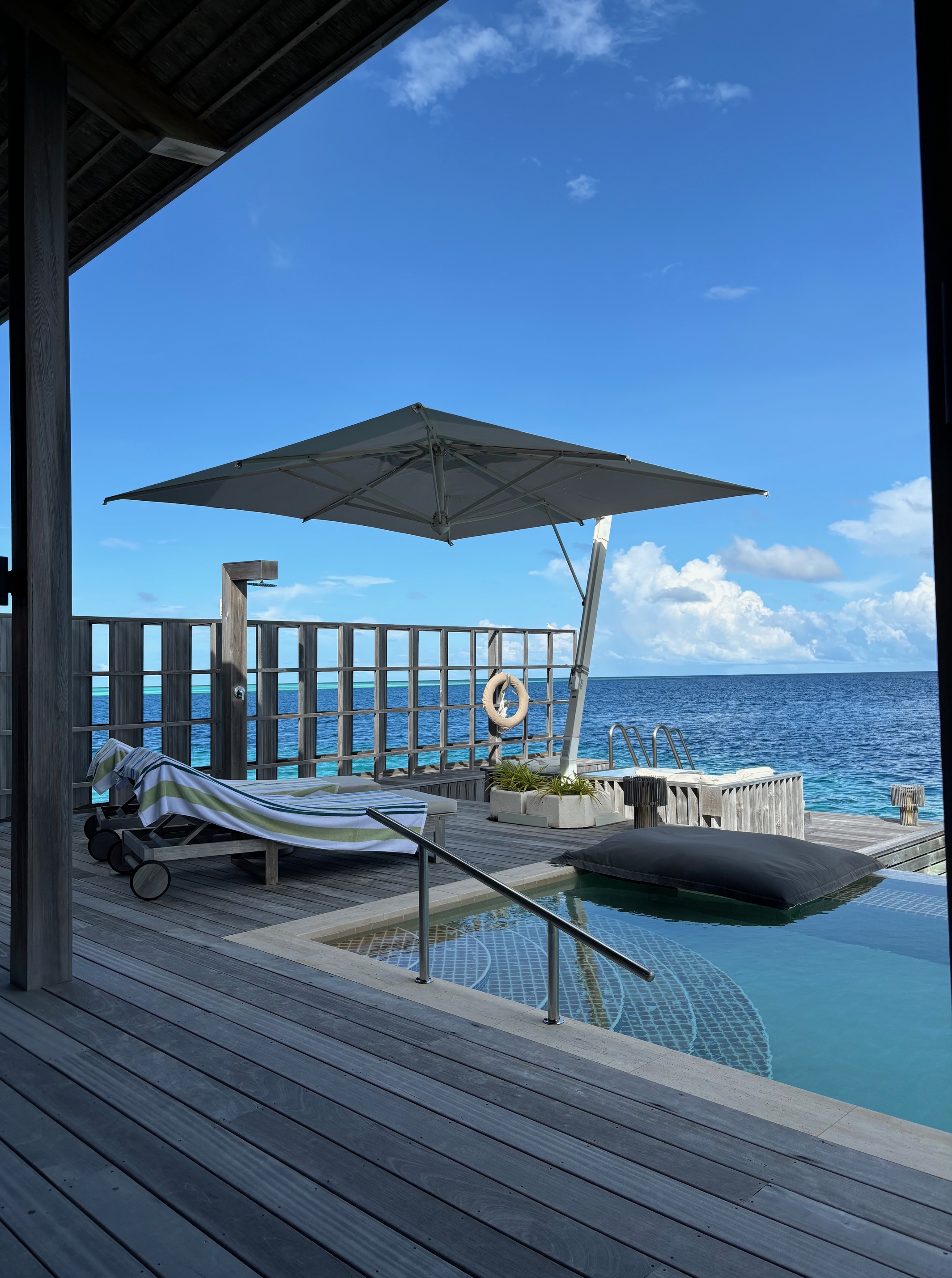 Another lovely breakfast, then an hour and a half reef snorkel for two of us, guided from a snappy speedboat by our JetSki guide. All beautiful, glad C got to see — she does well, though hampered by her overlarge life jacket. Lunch, then another full-on spa experience, including Himalayan salt room, full body massage with aloe treatment, and a couples bath in the beautifully prepared bathtub overlooking the sea. Later, after a nap —and an impromptu haircut on our deck from Tamil, the deck captain! — on the main building deck with musical accompaniment by Nish, a Maldivian singer-she’s wonderful. It’s Indian-themed night, with tandoori cooking to order and wonderful wine.